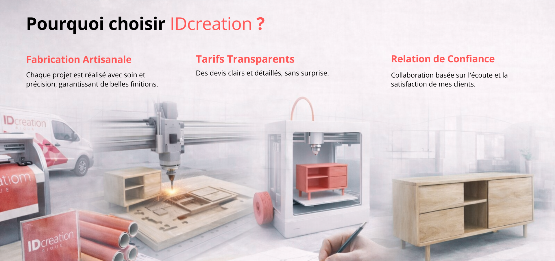 Passionné par l'innovation et la création, je m'appelle Guillaume Rique. J'ai fondé IDcreation pour offrir un service artisanal de haute qualité en impression 3D, découpe laser, CNC bois / usinage et découpe adhésif, mobilier & agencement pour des projets personnalisés.